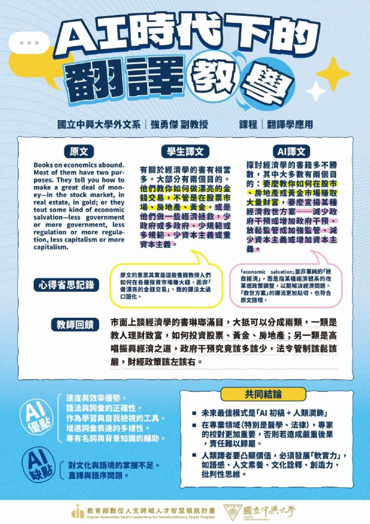 說明:「翻譯學應用」課程將AI導入課程作為翻新的重點,嘗試建構出一套能回應AI浪潮、同時培養學生翻譯能力的教學模式。學生先行獨立完成翻譯,再與AI生成的譯文進行比較,最後由教師提供專業譯者的參考版本,給予統整性回饋。