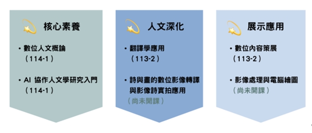 「數位內容策展」及「翻譯學應用」已於113學年度第2學期開設完成。「AI協作人文學研究」及「數位人文概論」於114學年度第1學期開設,目前仍在進行中。「詩與畫的數位影像轉譯與影像詩實拍應用」及「影像處理與電腦繪圖」預計於114學年度第2學期開設。